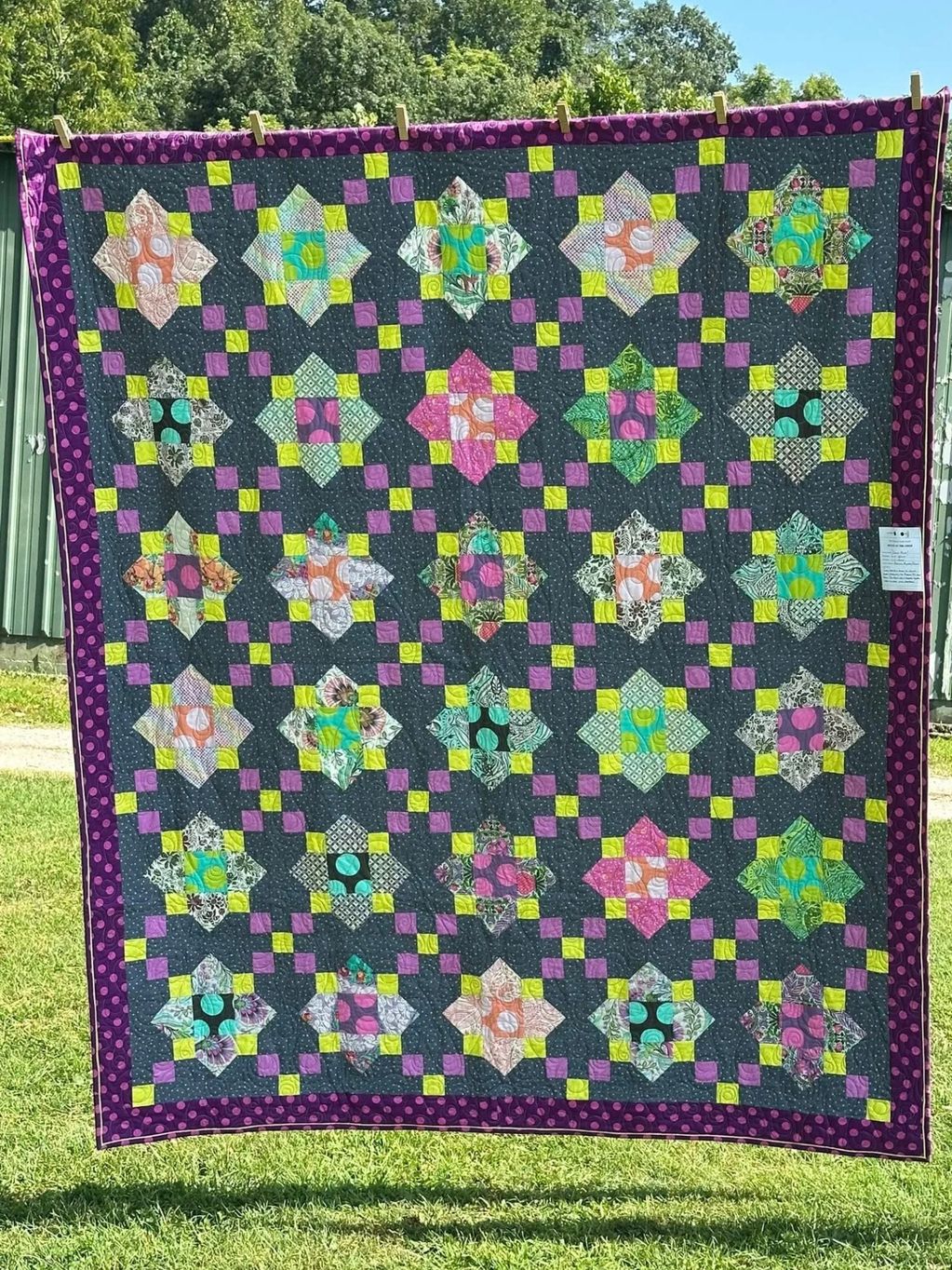 This was a mystery quilt taught online by Cindy Grisdela during a workshop hosted by the Asheville Quilt Guild. I used Tula Pink Roar fabric.